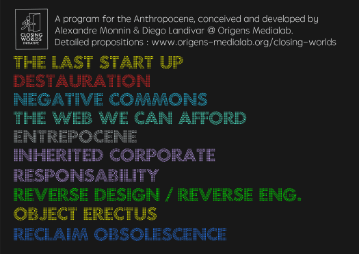 Closing Worlds est aussi un projet artistique-grammatical qui cherche à identifier comment l’anthropocène vient tordre le langage ainsi que les outils de gestion managérial et entrepreunerial. A ce titre nous travaillons avec l’artiste Djtal Humain :
